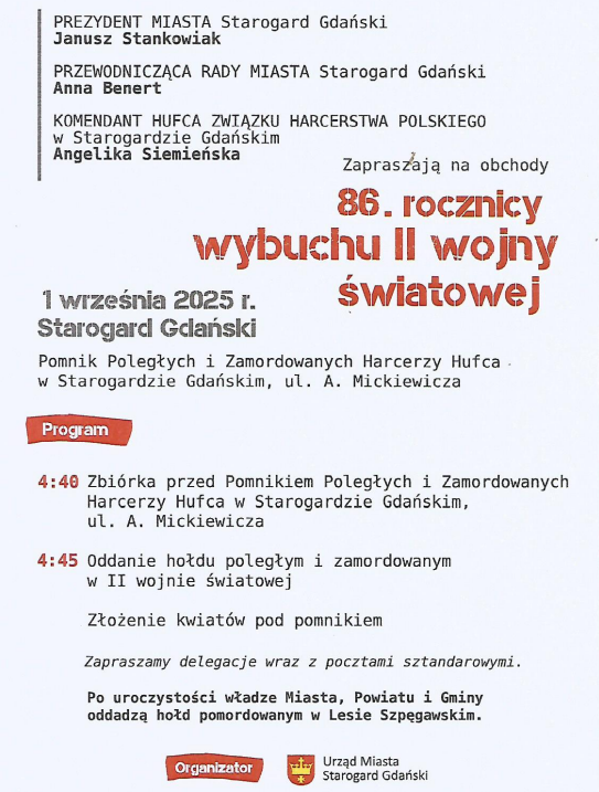 Prezydent Miasta Starogard Gdański, Rada Miasta oraz Hufiec ZHP w Starogardzie Gdańskim zapraszają na uroczystości upamiętniające 86. rocznicę wybuchu II wojny światowej.